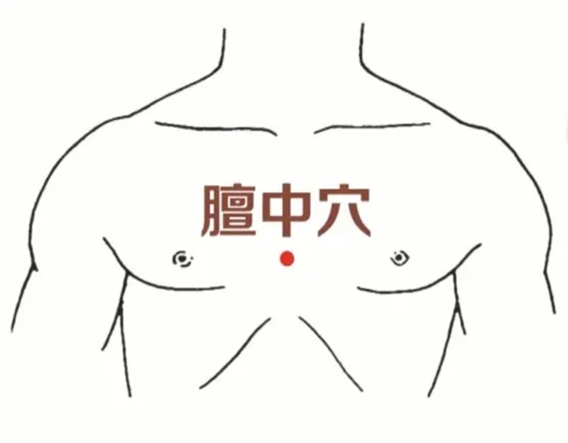 膻中穴位于两侧乳头正中央。以膻中穴为中心,上下左右轻柔按揉60次即可,力度以微酸胀感为宜。