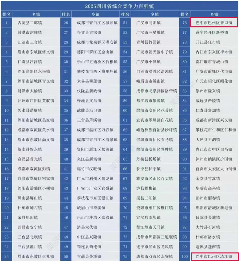 近日,竞争力智库、北京中新城市规划设计研究院等机构在北京联合发布《四川省乡镇综合竞争力报告2025》,揭晓“2025四川省综合竞争力百强镇”(简称“2025四川省百强镇”)名单。
