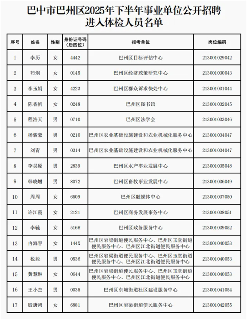根据《公告》规定,本次巴州区事业单位公开招聘进入体检环节的人员共17名。