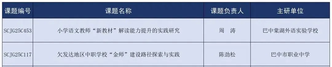 本次巴州区入选课题为巴中棠外《小学语文教师“新教材”解读能力提升的实践研究》、市职中《欠发达地区中职学校“金师”建设路径探索与实践》。