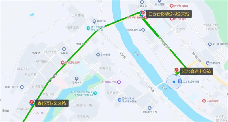 江北客运中心(始发站)、白云台移动公司公交站、容邦万达公交站。