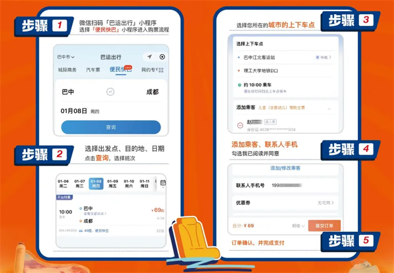 小伙伴们,大家期待的便民快巴真的来了,1月8日正式开行,50座电动大巴,舒适便捷,往返巴中与成都,从此更轻松!