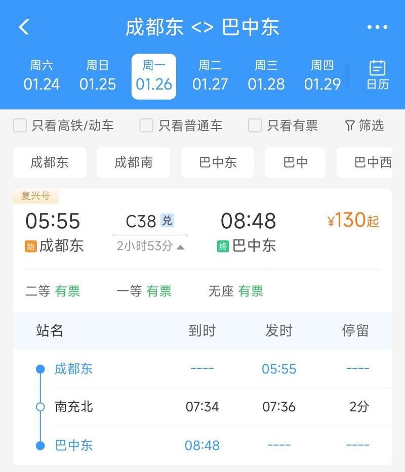 增开成都东至巴中东C38次列车,成都东05:55开,沿途停靠南充北,08:48抵达巴中东,全程运行2小时53分。目前巴中东至成都东C35次列车运行时间待定。