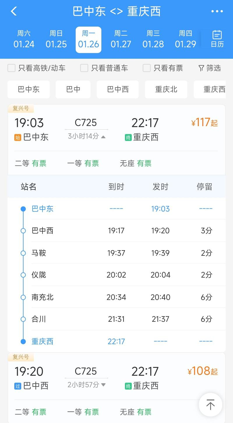 原巴中至重庆北的C725次列车,改由巴中东始发,终到站调整至重庆西,走巴南高铁线路。巴中东19:03开,沿途停靠巴中西(19:17/19:20)、马鞍、仪陇、南充北、合川,22:17抵达重庆西,全程运行3小时14分。