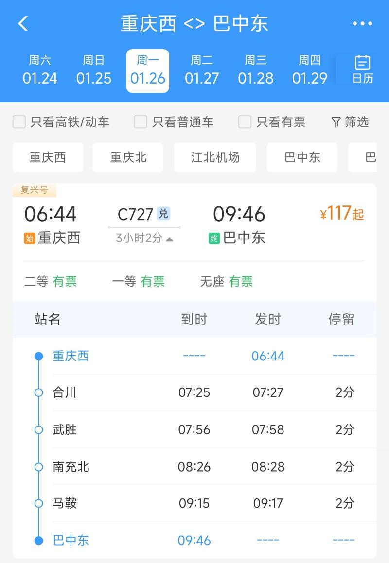 原重庆西至巴中的C726次列车,调整为重庆西至巴中东,车次为C727次,走巴南高铁线路。重庆西06:44开,沿途停靠合川、武胜、南充北、马鞍,09:46抵达巴中东,全程运行3小时2分。