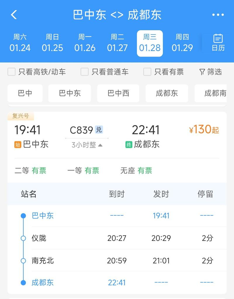 增开巴中东至成都东C839次列车,巴中东19:41开,沿途停靠仪陇、南充北,22:41抵达成都东,全程运行3小时。1月28日起运行。
