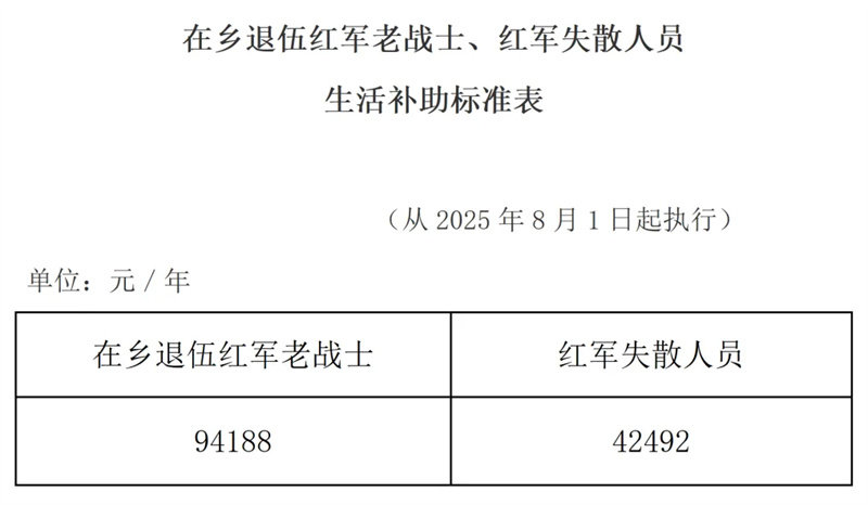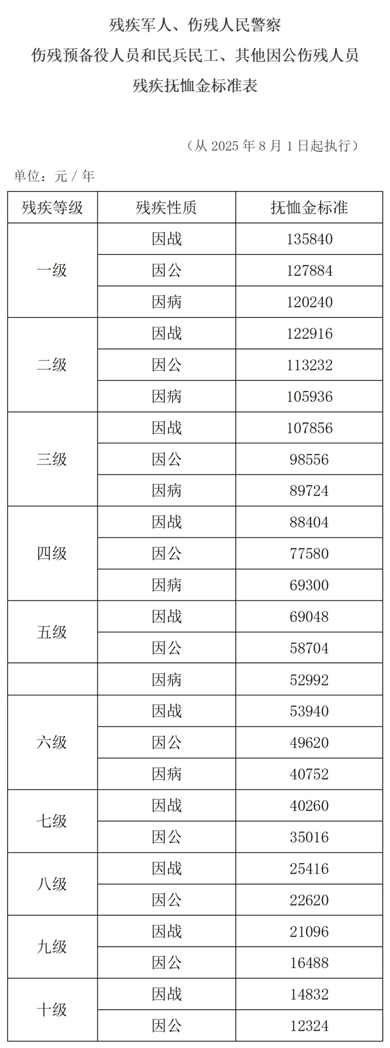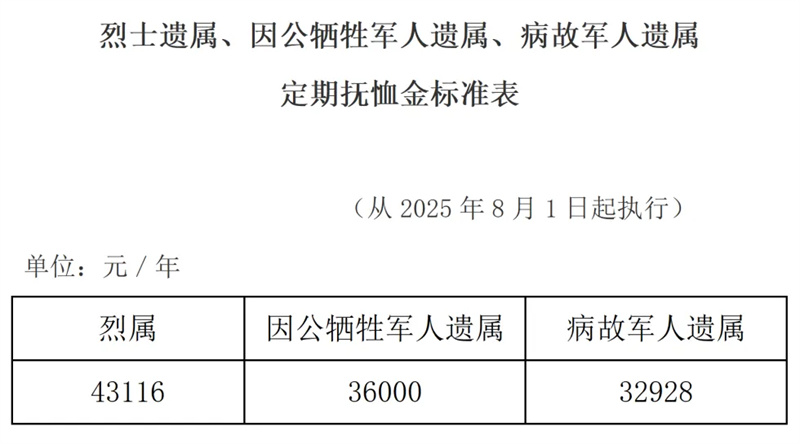 其中,一级因战、因公、因病残疾抚恤金分别提高至每人每年135840元、127884元、120240元,十级因公残疾抚恤金提高至每人每年12324元,烈士遗属、因公牺牲军人遗属、病故军人遗属、在乡复员军人、带病回乡退役军人、部分参战参试退役军人、部分老年烈士子女、部分年满60周岁农村籍退役士兵的抚恤金和相关补助金标准普遍提高。