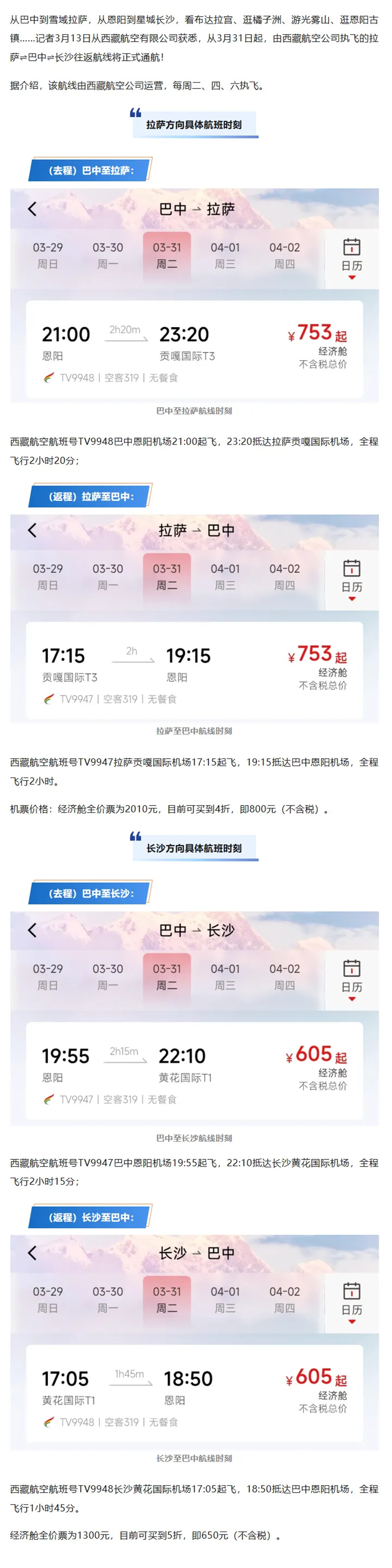 直达拉萨和长沙!3月31日起巴中将开通两条新航线