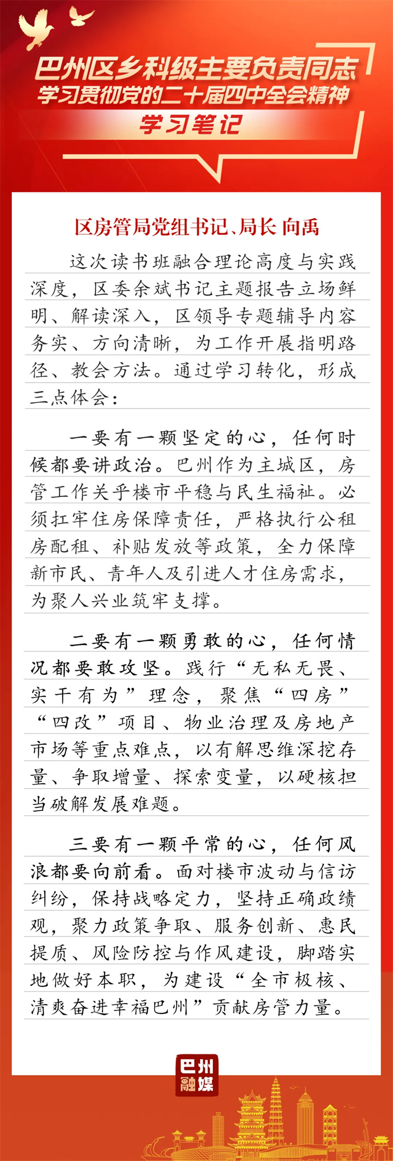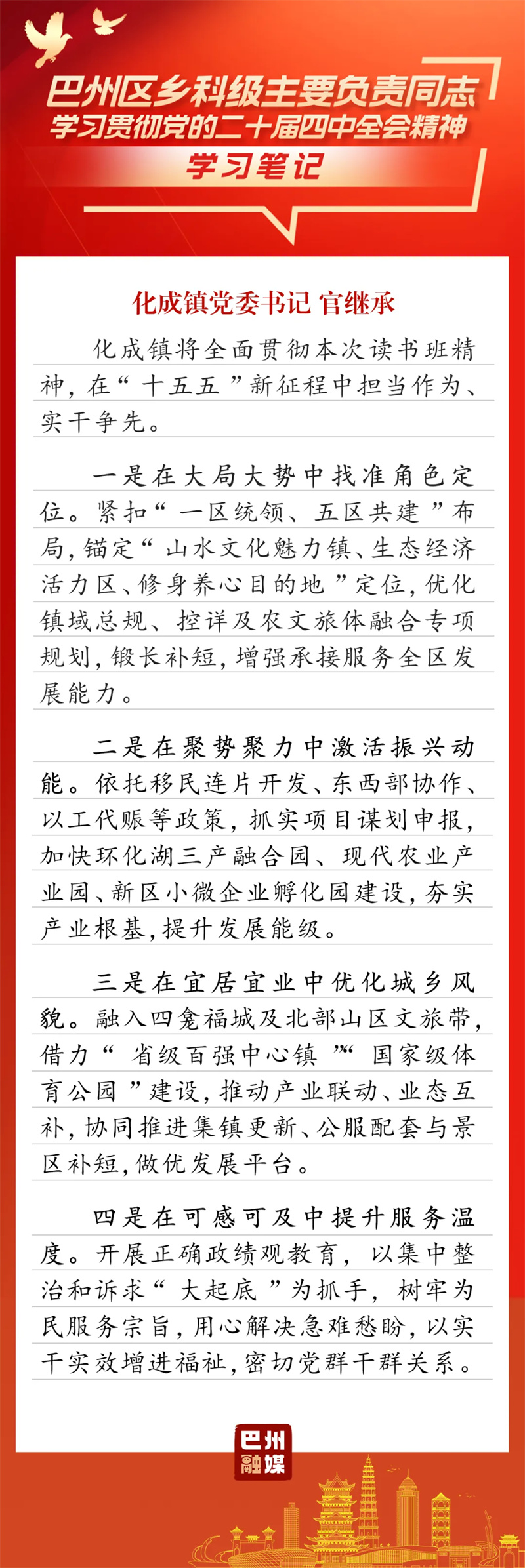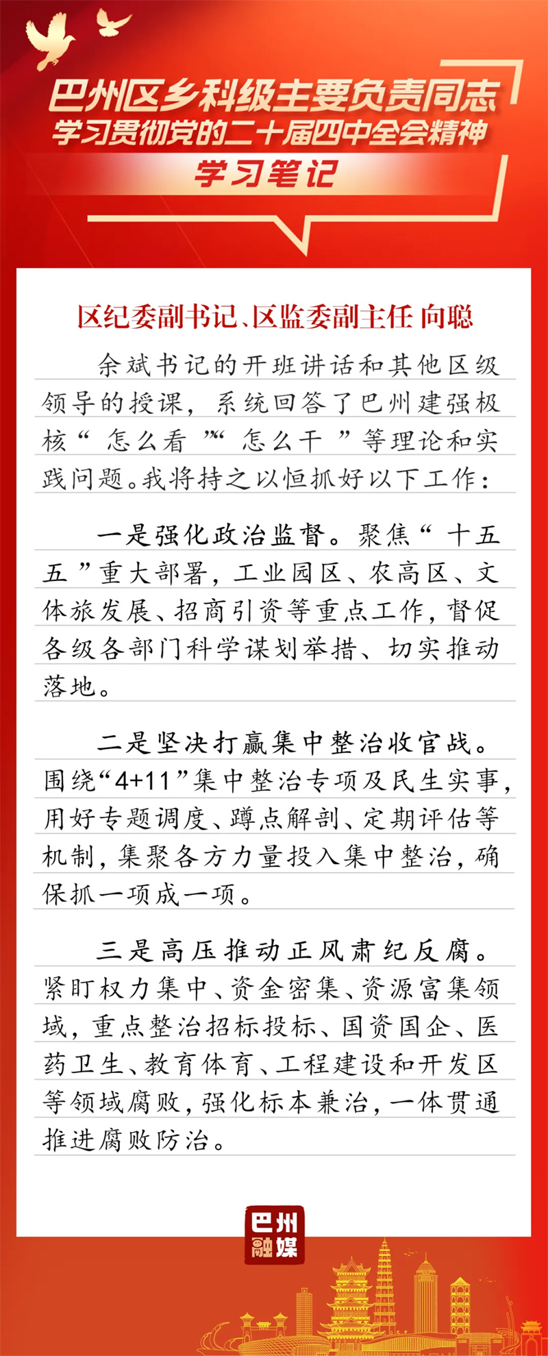 3月19日-22日,巴州区乡科级主要负责同志学习贯彻党的二十届四中全会精神读书班如期举行。整个学习过程将专题辅导、分组研讨和个人自学融为一体,内容安排饱满充实,形式运用灵活多元。学员们深入思考、用心体悟,在交流中碰撞思想、凝聚共识。翻开他们的学习笔记,一起来感受这次读书班的收获与成效吧!