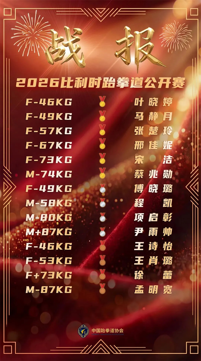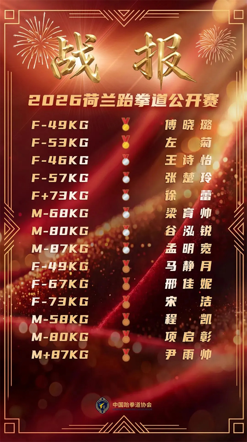 本次比利时跆拳道公开赛作为高规格G1级别赛事,吸引了全球76个国家和地区的562名运动员同台竞技,赛事竞争异常激烈。中国跆拳道队派出26名队员出战全部16个级别,最终以6金4银4铜的优异成绩收官,女子队伍更是在8个比赛级别中7个级别斩获奖牌,尽显全级别均衡竞技水平,宋洁便是这支巾帼队伍中的中坚力量。而此前的荷兰跆拳道公开赛,是中国队结束冬训后首次亮相国际赛场,宋洁在该赛事中率先站稳领奖台,为后续征战比利时赛场积累了宝贵的实战经验。